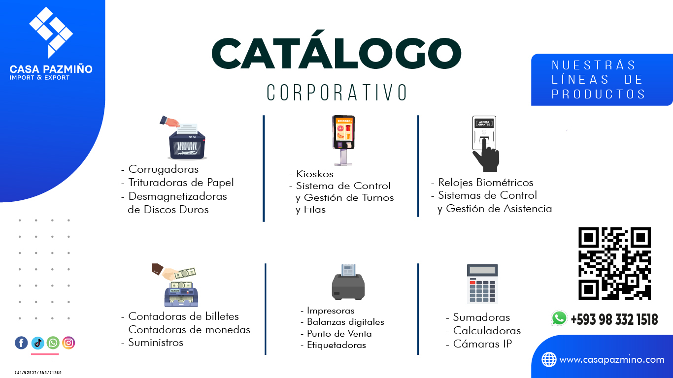 ANTOFILOPRODUCTOS-100KIOSKOS-100CATSISTEMA-100Lectores Biométricos Leer más Equipos de Huella Digital Lector Biométrico con Modulo de Proximidad FR1200 Leer más Leer más Equipos de Huella Digital Lector Biométrico para Control de Acceso MA300 Leer más Leer más Equipos de Huella Digital Lector de Huellas Digitales Secugen Hamster Plus Leer más Leer más Equipos de Huella Digital Lector de Huellas Digitales UareU4500 Leer más Productos destacados Leer más Contadoras de Billetes Contadora de Billetes 3NSTAR BC-1005 Leer más Leer más Calculadoras Calculadora Grafica Casio FX9860 GIII Leer más Leer más Gavetas de Dinero GAVETA 3NSTAR CD250 Leer más Leer más Impresión Impresora EPSON TM-U220 Leer más Equipos de Oficina Leer más Linea Dahle DAHLE PS100 Leer más Leer más Linea Dahle DAHLE PS140 Leer más Leer más Destructoras de Documentos DAHLE SM300 Leer más Leer más Linea Dahle DAHLE SM90 Leer más Nuestros Clientes BANCOSSECTOR BANCARIOCOMIDASECTOR ALIMENTICIOEMBAJADASEMBAJADASSECTOR PÚBLICOSECTOR PÚBLICO Marcas Que Distribuimos SLIDER BIOMETRICSLIDER SECURITYSLIDER PRINTSLIDER POINTSLIDER COUNTERCONTACTO 1 Step 1NombreApellidoEmpresa o Entidad0 / 100RUC0 / 100Dirección0 / 100Número Celular0 / 100E-MAIL de contactoUn E-MAIL válidoemailRequerimiento Puntual0 / 500Ciudad0 / 500Teléfono convencional0 / 100Sitio Web0 / 100En cumplimiento de la Ley Orgánica de Protección de Datos Personales, por medio de este Formulario de Contacto está enviando datos personales a los cuales Casa Pazmiño S.A. podrá tener acceso y tratarlos conforme la normativa vigente y por ende el envío constituye el consentimiento expreso.pick one!Acepto la Política de Tratamiento de datos personales y autorizo contacto por medios digitales.Enviar keyboard_arrow_leftPrevious Nextkeyboard_arrow_rightFormCraft - WordPress form builder